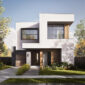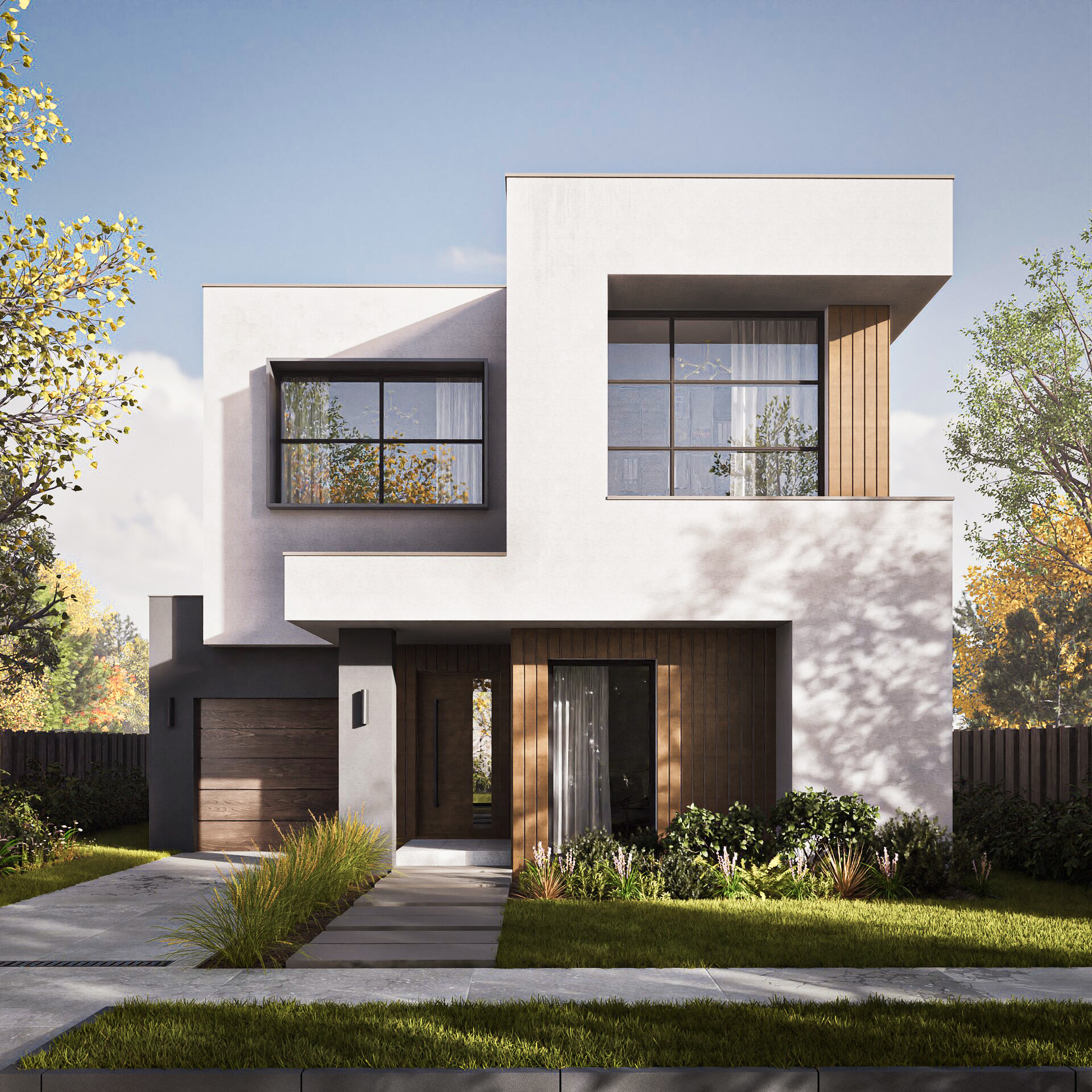 Wizualizacja budynku o prostej bryle, geometrycznej formie – minimalizm w najlepszym wydaniu. Idealne rozwiązanie na miejską lub podmiejską działkę o niewielkich rozmiarach.