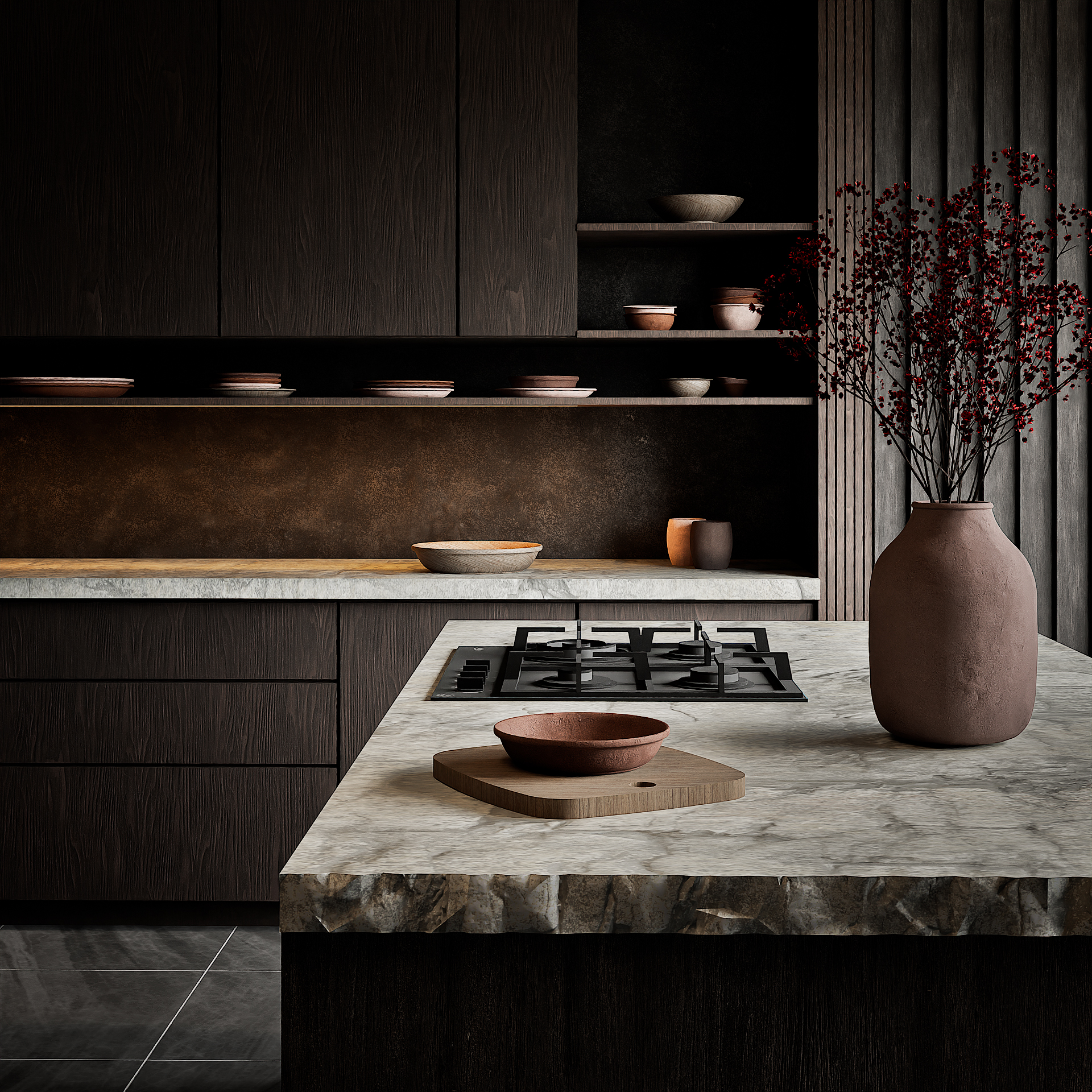Ciemne drewno, naturalny kamień i subtelna ceramika – kuchnia, która zachwyca spokojem formy i szlachetnością materiałów. Fronty z głęboko wybarwionego drewna tworzą eleganckie tło dla wyrazistej wyspy wykonanej z naturalnego kamienia, której nieregularne, surowe krawędzie podkreślają jej unikatowy charakter. Matowe powierzchnie, prosta zabudowa oraz minimalistyczna płyta gazowa pozwalają materiałom grać tu pierwsze skrzypce. Ciepło kompozycji dopełniają dodatki z ceramiki i drewna, a duży wazon z suszonymi kwiatami wprowadza do wnętrza nutę naturalności i spokoju.